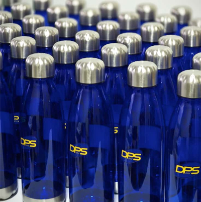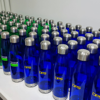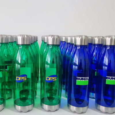 Botella plástica reutilizable con detalles en acero inoxidable, liviana y práctica, ideal para uso diario. En esta oportunidad nuestra cliente opto por logo en ambas caras.