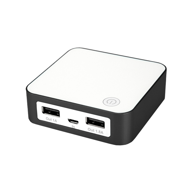 Power Bank cargador USB de plástico ABS con borde metálico. Capacidad 8400mAh. Incluye cable USB + 3 adaptadores para Conector Lightning, USB tipo C, Micro-USB, etc. Batería recargable incorporada.